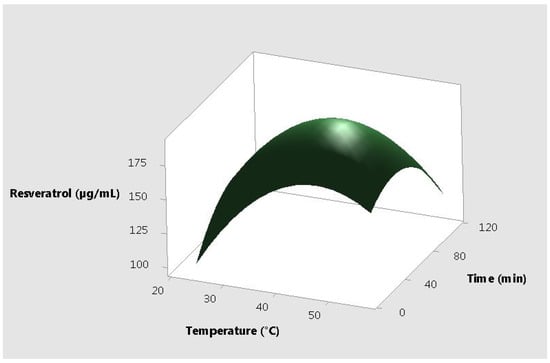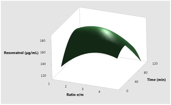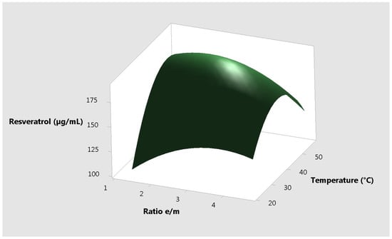 The results from the response surface regression: resveratrol versus ratio e/m, temperature, time are presented in Table 2.