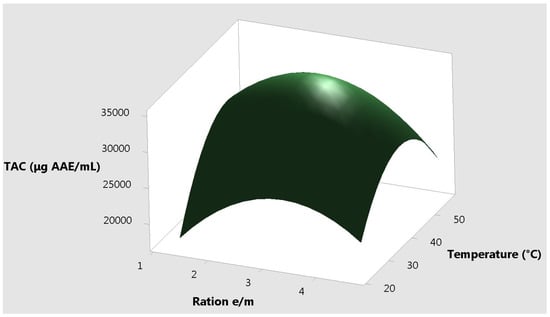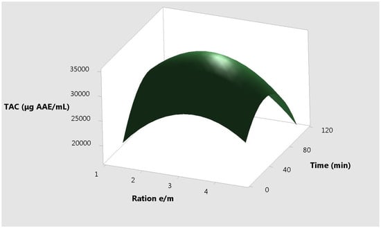 The response surface regression: TAC versus ratio e/m, temperature and time, obtained from de data using Minitab, is presented in Table 3.