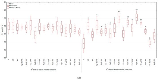 (A) Effect of the foliar application of botanical extracts on the dry weight of celeriac leaves rosette (N = 3). (a) Statistically significant differences (p < 0.05) between the control group (C) and extracts. (b) Statistically significant differences (p < 0.05) between water formulation (CF) and extracts. (c) Statistically significant differences (p < 0.05) between commercial biostimulant (CB) and extracts. 1st term of leaves rosette collection—samples taken for analyses 7 days after the second spraying. 2 term of leaves rosette collection—samples taken for analyses after harvesting. Abbreviations: UAE, ultrasound assisted extraction; MH, mechanical homogenisation; Hp H, Hypericum perforatum L. (St. John’s wort, herb); Sg L, Solidago gigantea Ait. (giant goldenrod, leaf); To F, To L, Taraxacum officinale (L.) Weber ex F.H. Wigg (common dandelion, flower, leaf); Tp F, Trifolium pratense L. (red clover, flower); Ur L, Urtica dioica L. (nettle, leaf); Vo R, Valeriana officinalis L. (valerian, root). (B) Effect of the foliar application of botanical extracts on the dry weight of celeriac roots (N = 3).