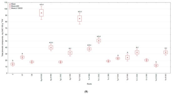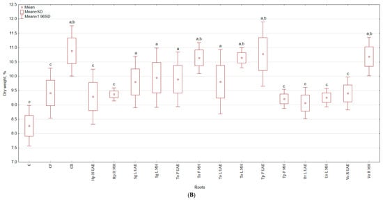 In general, for all examined extracts, the content of macroelements (with the exception of nitrogen) in roots was higher than for the control group (C) and commercial biostimulant (CB) (Table 4). Different extracts were responsible for the highest content of a given element in roots—N (Vo R UAE), P (Tp F MH), K (Sg L UAE), Ca (Ur L UAE), Mg (Sg L UAE) and S (To L MH). It is not possible to clearly state which extraction method will provide a more valuable macroelement composition of roots.