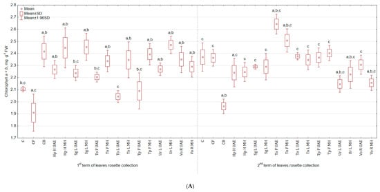 For the determination of the content of chlorophyll a + b (mg·100 g−1 fresh weight, FW) and carotenoids (µg·100 g−1 FW) [14,15,83], the freshly collected celeriac leaves (0.4 g) were comminuted to a smooth paste in a mortar with a few drops of acetone (80%), pinch of sand and calcium carbonate. Then, the mixture was filtered using Schott filter and vacuum pump, quantitatively transferred to a volumetric flask (50 mL) and filled up with the solvent. The measurements (in four replicates) of absorbance (663, 645, and 470 nm) were made immediately after preparing the solutions with the use of portable visible spectrophotometer (HACH DR1900, Berlin, Germany). The formulas for the calculations are presented in our previous study [14,15].