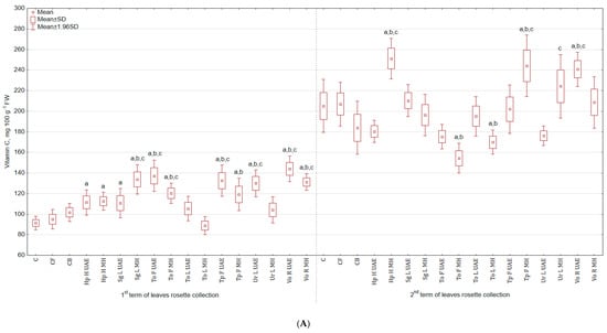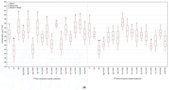 The highest content of vitamin C was observed in leaves (Figure 3A), mostly after the second application of extracts. For instance, Vo R UAE increased the content of this vitamin by 57.6% and 41.6% in the first harvest, while Hp H MH increased the content by 22.3% and 36.5% in the second harvest in comparison to C and CB, respectively. The lowest values were observed in leaves collected in the 1st term for To L MH (2.8% and 12.2% less) and for the 2nd term for To F MH (24.7% and 15.8% less). In the case of roots (Figure 3B), the greatest level of vitamin was noted in the group treated with Ur L UAE (22.9% and 21.2% more than in C and CB), while the lowest for Vo R UAE (13.9% and 15.1% less).