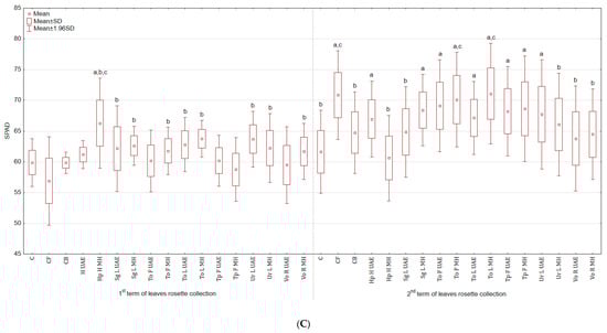 (A). Effect of the foliar application of botanical extracts on the chlorophyll a + b content of celeriac leaves (N = 4). (B) Effect of the foliar application of botanical extracts on the carotenoids content of celeriac leaves (N = 4). (C) Effect of the foliar application of botanical extracts on the SPAD values of celeriac leaves (N = 10). (a) Statistically significant differences (p < 0.05) between the control group (C) and extracts. (b) Statistically significant differences (p < 0.05) between water formulation (CF) and extracts. (c) Statistically significant differences (p < 0.05) between commercial biostimulant (CB) and extracts. 1st term of leaves rosette collection—samples taken for analyses 7 days after the second spraying. 2nd term of leaves rosette collection—samples taken for analyses after harvesting. Abbreviations: UAE, ultrasound assisted extraction; MH, mechanical homogenisation; Hp H, Hypericum perforatum L. (St. John’s wort, herb); Sg L, Solidago gigantea Ait. (giant goldenrod, leaf); To F, To L, Taraxacum officinale (L.) Weber ex F.H. Wigg (common dandelion, flower, leaf); Tp F, Trifolium pratense L. (red clover, flower); Ur L, Urtica dioica L. (nettle, leaf); Vo R, Valeriana officinalis L. (valerian, root).