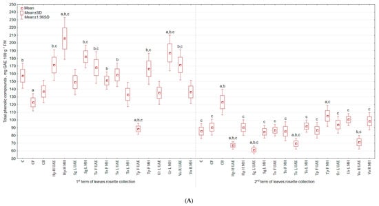 (A) Effect of the foliar application of botanical extracts on the total phenolic compounds of celeriac leaves (N = 4). (B) Effect of the foliar application of botanical extracts on the total phenolic compounds of celeriac roots (N = 4). (a) Statistically significant differences (p < 0.05) between the control group (C) and extracts. (b) Statistically significant differences (p < 0.05) between water formulation (CF) and extracts. (c) Statistically significant differences (p < 0.05) between commercial biostimulant (CB) and extracts. 1st term of leaves rosette collection—samples taken for analyses 7 days after the second spraying. 2nd term of leaves rosette collection—samples taken for analyses after harvesting. Abbreviations: UAE, ultrasound assisted extraction; MH, mechanical homogenisation; Hp H, Hypericum perforatum L. (St. John’s wort, herb); Sg L, Solidago gigantea Ait. (giant goldenrod, leaf); To F, To L, Taraxacum officinale (L.) Weber ex F.H. Wigg (common dandelion, flower, leaf); Tp F, Trifolium pratense L. (red clover, flower); Ur L, Urtica dioica L. (nettle, leaf); Vo R, Valeriana officinalis L. (valerian, root).