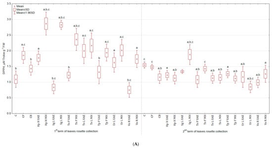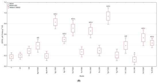 The highest antioxidant activity, measured using DPPH test, in leaves (Figure 5A) collected in the first term was observed for Hp H UAE (1.6 and 1.5 times more than in C and CB) and the lowest for Vo R UAE (31.8% and 35.3% less than in C and CB), while the highest in leaves harvested in the second term for Sg L MH (21.3% and 62.2% more than in C and CB) and the lowest for Ur L MH (45.2% and 26.7% less than in C and CB). Extract from Tp F UAE increased the antioxidant activity in roots by more than 4 and 2 times in comparison to C and CB, and Ur L MH lowered by 27.8% and 55.2% (Figure 5B).