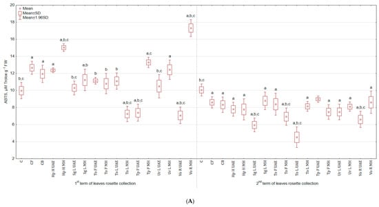 (A) Effect of the foliar application of botanical extracts on the antioxidant activity ABTS of celeriac leaves (N = 4). (B) Effect of the foliar application of botanical extracts on the antioxidant activity ABTS of celeriac roots (N = 4). (a) Statistically significant differences (p < 0.05) between the control group (C) and extracts. (b) Statistically significant differences (p < 0.05) between water formulation (CF) and extracts. (c) Statistically significant differences (p < 0.05) between commercial biostimulant (CB) and extracts. 1st term of leaves rosette collection—samples taken for analyses 7 days after the second spraying. 2nd term of leaves rosette collection—samples taken for analyses after harvesting. Abbreviations: UAE, ultrasound assisted extraction; MH, mechanical homogenisation; Hp H, Hypericum perforatum L. (St. John’s wort, herb); Sg L, Solidago gigantea Ait. (giant goldenrod, leaf); To F, To L, Taraxacum officinale (L.) Weber ex F.H. Wigg (common dandelion, flower, leaf); Tp F, Trifolium pratense L. (red clover, flower); Ur L, Urtica dioica L. (nettle, leaf); Vo R, Valeriana officinalis L. (valerian, root).