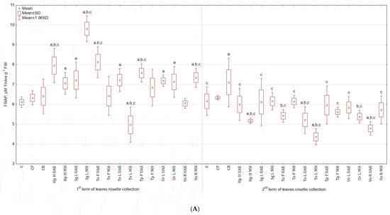 The examined extracts from St. John’s wort (Hp H), giant goldenrod (Sg L), common dandelion (To F, To L), red clover (Tp F), nettle (Ur L), valerian (Vo R) did not exhibit a significant effect on the increase in the content of macroelements (especially N, P, K, Ca and Mg) in the celeriac leaves when compared with the control group (distilled water) (Table 3). The only exception is the higher sulphur content in leaves in the experimental groups (excluding Ur L MH, Vo R UAE and Vo R MH) than in the control group (C). Generally, almost all examined extracts provided higher content of K, Ca and S in leaves when compared with the commercial biostimulant (CB). Comparing the highest content of elements in the celeriac biomass and the extraction methods, plant extracts obtained by UAE determined a higher content of N, K, Ca and Mg in celeriac leaves, and obtained by MH—P and S. It cannot be clearly indicated which extract promoted to the greatest extent the accumulation of elements in celeriac leaves.