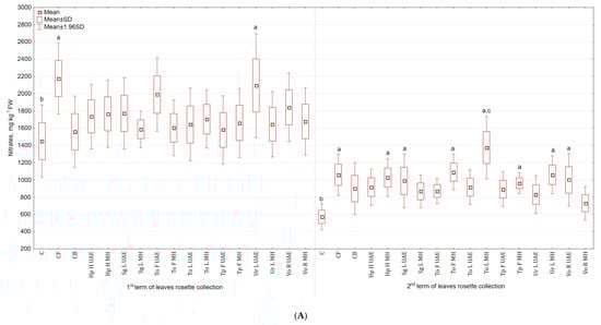 It was found that nitrates content in the above ground parts was higher (in the second term the differences were statistically significant) (Figure 8A), while in roots was lower (Figure 8B) than in the control group. The application of To L MH increased the content of nitrates in leaves (140% and 52.8% more than in C and CB). The lowest content of nitrates was observed in the group treated with Vo R MH (27.5% more than in C and 18.8% less than in CB). The application of Ur L MH decreased the content of nitrates in roots (49.4% and 26.5% less than in C and CB). Spraying celeriac with Tp F UAE caused the highest accumulation of nitrates, but still lower than in the control group (15.8% less than in C and 22.2% more than in CB).