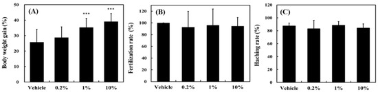 Effect of Antrodia cinnamomea extraction waste (ACEW) supplementation on (A) weight gain, (B) fertilization rate, and (C) hatching rate of zebrafish during 30-day cultivation. For the body weight gain study, thirty adult fish were used in each group and put in the same aquarium. For the reproduction study, three males were paired with three female fish for each group in the mating tank one night before spawning event. Significant difference compared with the vehicle group was denoted as *** p < 0.001.