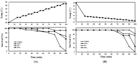 Effect of ACEW supplementation on survival rate of zebrafish under rapid temperature changes. Each group of 12 adult zebrafish was fed with a specified diet for 30 days before the experiment, and then underwent the rapid temperature changes as: (A) the heating challenge experiment; (B) the cooling challenge experiment. The time course of temperature change is described in Section 4.6.