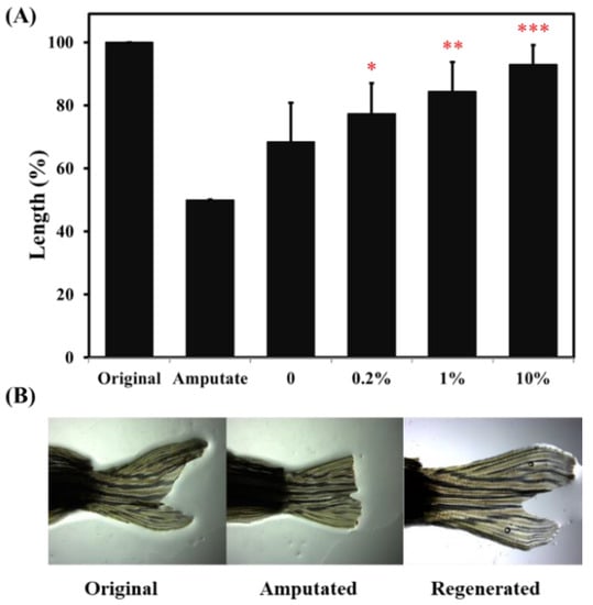 The zebrafish have the fascinating ability to regenerate lost or damaged tissues such as caudal fin. This study compared the regenerative ability of fish by caudal fin amputation and observed their recovery. In this experiment, zebrafish were fed with 0.2%, 1% and 10% ACEW for one month, respectively, and then half of the length of caudal fins were cut off. After three weeks of recovery under normal culture conditions, the caudal fin length was measured to evaluate the fish’s regeneration ability. Figure 4 shows that the supplement of ACEW dramatically increased zebrafish’s regeneration ability dose-dependently. The caudal fin length could be recovered to 68.4 ± 12.3%, 77.3 ± 9.7% (p < 0.05), 84.4 ± 9.2% (p < 0.01) and 93 ± 6.1% (p < 0.001) of the original length for the vehicle, 0.2%, 1% and 10% ACEW groups, respectively.