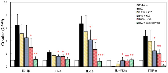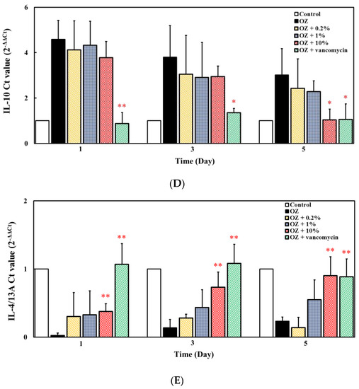 In the prevention mode experiment, zebrafish were fed with 0.2%, 1% and 10% ACEW for 30 days, respectively, and then 0.2% oxazolone were intrarectally instilled to induce acute enteritis. As shown in Figure 5, when zebrafish was stimulated with 0.2% oxazolone (group OZ), the gene expression of TNF-α, IL-1β, IL-6, and IL-10 were greatly increased. For the groups with ACEW supplement, the gene expressions of these cytokines were suppressed in a dose-dependent manner. Although the suppressive effects are less than that of the positive control (vancomycin), the ACEW still has the application potential for daily health care on zebrafish. On the other hand, for the gene expression of IL-4/13A, after 0.2% oxazolone induction, its expression level dropped significantly. If ACEW was added to the feed, it could restore the expression level of IL-4/13A to normal value, and this promotion effect was similar to that of the positive control group.