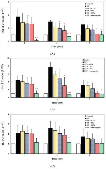 In the therapeutic mode experiment, 10 adult fish were anesthetized, and 0.2% oxazolone of 0.6 μL/100 mg body weight was rectally instilled. After 5-h induction of acute enteritis, fish were fed with 0.2%, 1%, and 10% ACEW, respectively. On day-1, -3, and -5, gene expression of related cytokines was analyzed by qRT-PCR (Applied Biosystems, Waltham, MA, USA).