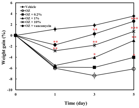 In addition, as shown in Figure 7, the stimulation of acute enteritis by oxazolone would cause significant decrease in fish’s body weight. The supplement of ACEW in the feed could reduce the symptoms of enteritis, so that the body weight did not drop too much. The average weight of the 10% ACEW group had returned to their initial weight value on the fifth day of treatment.