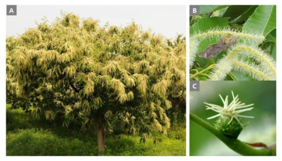 Picture of a chestnut tree including shape of tree (A), male and female flowers (B,C). The secretion of nectar is mainly from male flowers [11], and it can be found that male flowers are much more abundant than female flowers.