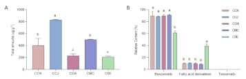 Fatty acid derivatives also represent a major chemical family involved in signaling molecules in intra- and inter-plant communication such as (E)-2-hexenal, (Z)-3-hexenol and methyl jasmonate, which are abundant in the plant kingdom and constitute another large class of plant volatiles [50]. This family was dominated by (Z)-3-hexen-1-ol in CSE, which is known to be typically emitted after mechanical damage and attract natural enemies of the herbivores, like wasps [51,52].