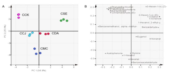 Principal component analysis (PCA) was performed to find the differences in VOCs across chestnut species. The first principal component (PC 1) represented 38.9% and the second PC (PC 2) 25.8%, which explained 64.7% of the total variance. A scatter plot of the PCA scores (Figure 3A) showed the distribution of each Castanea spp., and the corresponding loading plot (Figure 3B) showed the VOCs. The differences of the volatile profiles have been shown clearly amid Castanea spp. The CSE and CCK were separated by PC1. The CSE had PC2 scores positive, attributed to the compounds distributed in that quadrant, especially fatty acid derivatives.