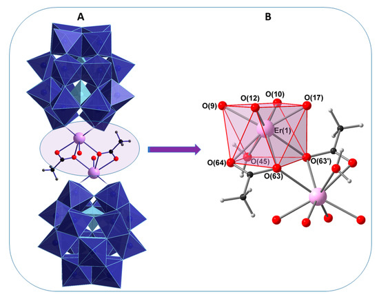 Combined polyhedral (A)/ball-and-stick (B) representation of 1 and the Er2 core. Color code: WO6 blue octahedra, PO4 sky blue tetrahedra, Er lavender, O red, C black, H small gray spheres.