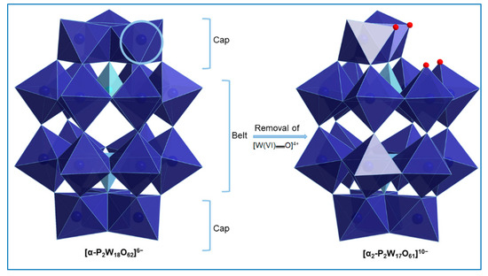 Formation of the [α2-P2W17O61]10− isomer by removal of a [W(VI)══O]4+ unit from the “cap” segment of the parent [α-P2W18O62]6− anion. Color code: WO6 blue octahedra, PO4 sky blue tetrahedra, O red spheres.