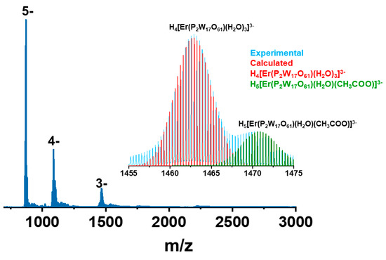 Solution and gas phase stability of the POM 1 was studied using electrospray ionization mass spectrometry (ESI MS). A Waters’ Synapt High Definition Mass Spectrometr (HDMS) was used for this purpose and the samples were measured in the negative ion mode (see experimental details for optimized parameters in SI). A few crystals were dissolved in water diluted with acetonitrile (ACN) at the 50:50 (v/v) ratio. While the crystal structure revealed a dimeric structure bonded through ErIII ions and acetate ligands, they fall apart during the electrospray condition. Several instrumental parameters were optimized to identify the intact ion but even at the lowest possible capillary voltage of 800 V, the two units were separated. The reason could be lesser stability of the intact molecule in the water/ACN mixture. To overcome this issue, the sample was dissolved in the mixture of water and 0.5 M LiOAc/HOAc buffer (pH 4.8) at the 50:50 (v/v) ratio but the intact ion was not found (Figure S4). About 20 µL of formic acid was added to exchange the alkali metal counter ions with H+ for the exact identification of the ion. The resulting mass spectrum is shown in Figure 3. Addition of further formic acid stabilized the 3- charge state with slight contribution from the 2- as shown in Figure S5. The 3- charge state was expanded in the inset. The two peaks corresponded to H5[Er(P2W17O61)(H2O)(CH3COO)]3− at m/z 1470 and H4[Er(P2W17O61)(H2O)3]3− at m/z 1463, respectively. Most of the water molecules seen in the crystal structure were lost during the electrospray process. One of the reasons for the fragmentation could be the exchange of acetate ligands by aqua ligands in aqueous medium during electrospray leading to monomeric units. The acetate ligands connected to the rare earth cation are labile enough to be potentially exchangeable with solvent water molecules or any organic substrates present in the solution [37,38]. The attempt to observe the intact ion in 1 M of LiOAc/HOAc buffer (pH 4.8) was not possible, since, even the dilute LiOAc/HOAc buffer (water and 0.5 M of LiOAc/HOAc buffer (pH 4.8) at a 50:50 (v/v) ratio) caused the contamination/blockage of the mass spectrometry chamber. The other and most probable reason could be coulomb repulsion between two highly negatively charged cores in very close proximity leading to the fragmentation during electrospray.