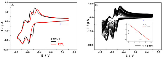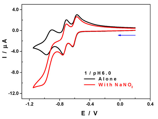 The reduction of the nitrite ion is a classical test to evaluate the electrocatalytic performance of POMs [42,43]. It was carried out in 1.0 M of LiOAc + HOAc at pH 6, a medium in which the interference from the H.E.R (hydrogen evolution reaction) is negligible and the predominant species of the substrate is the ionic form NO2− (HNO2/NO2−; pKa = 3.2). Figure 6 shows the CV of 1 in the absence and in the presence of a large excess of nitrite ([NaNO2]/[1] = 50). At a low scan rate, v = 10 mV.s−1, there was an electrocatalytic reaction starting right after the second reduction step of 1, Eonset = −0.85 V vs. SCE. This reduction wave was irreversible and its shape was typical of an electrocatalytic process. The comparison of the maximum currents in the absence and in the presence of nitrite ion revealed an increase higher than 350%.