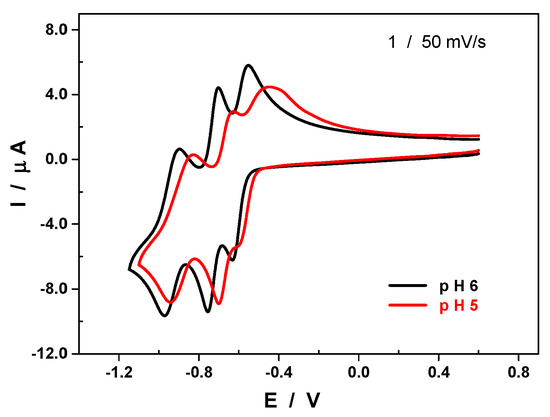 When the pH of the electrolyte was varied while keeping the buffer concentration constant, a trend was observed where the peak potentials shifted towards the anodic side of the scale upon decreasing the pH, as expected [40,41]. Additionally, the distinction between the first two reduction steps became less obvious (Figure 5). This behavior indicates not just a marked alkaline character, but also that the electron transfer is concomitant with proton exchange. A quick assessment of the variation of the reduction peak potential of the first and of the second waves as a function of the pH indicates that the number of protons exchanged equals that of the electrons transferred (Figure S9). Having said that, a more accurate study would require a broader pH range to be considered.
