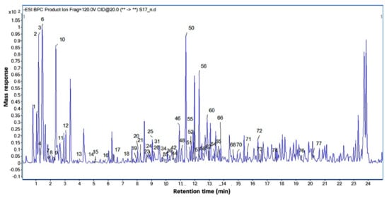 Interpretation of MS spectral data allowed for the identification of several phenolic acids including dihydroxybenzoic acid (15) and salicylic acid (23), that was proved by the characteristic loss of 44 amu corresponding to the loss of CO2 [35]. Asides, syringic acid (peak 40) exhibited a deprotonated molecular ion [M − H]− at m/z 197.0476 and a subsequent loss of a methoxy group at m/z 167 in the MS2 spectrum. Other benzoate derivatives including a methyl ester (16) and sugar conjugates (17, 21, 22) were also identified (Figure S1) in accordance with the literature [24,35].