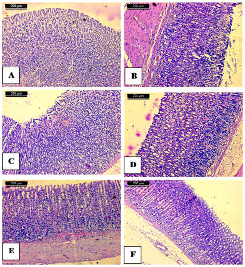 After measuring the ulcer area, small pieces of stomachs from each group were embedded in paraffin wax. Sections of 5 µm thick were cut in a microtome and mounted on glass slides using standard techniques. After staining the tissues with hematoxylin-eosin stains, the slides were viewed under a light microscope equipped for photography [86].