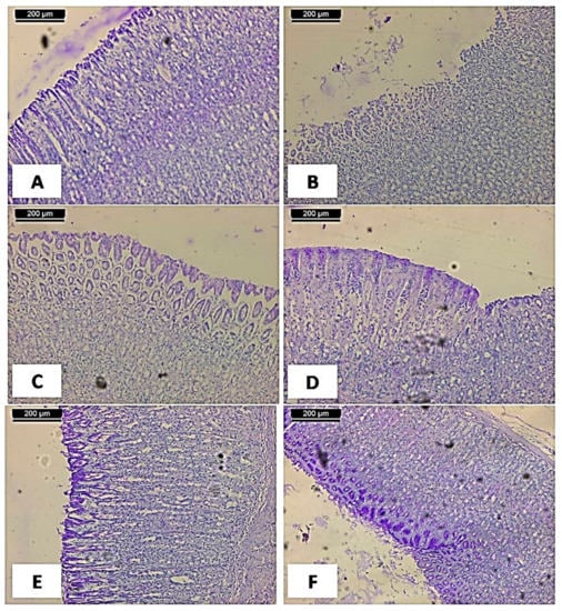 To evaluate gastric mucosal glycoprotein, sections (5 µm) of each stomach were stained with periodic acid Schiff (PAS) in order to take clear observation of gastric epithelial mucus secretion and to indicate a better assessment of any changes in glycoprotein [87].