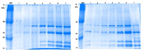 - Laemmli, U.K. Cleavage of structural proteins during the assembly of the head of bacteriophage T4. Nature 1970, 227, 680–685. [Google Scholar] [CrossRef] [PubMed]