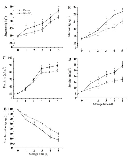 Figure 2 shows the content changes of sucrose, glucose, fructose, sorbitol, and starch. The contents of sucrose, glucose, and fructose gradually increased in both CO2-treated and control groups during storage, while the starch content continued to decrease. Compared with the control group, CO2 treatment significantly induced the accumulation of sucrose, glucose, fructose, and sorbitol, while the decomposition of starch was promoted (p < 0.05). Compared with the control group, sucrose, glucose, fructose, and sorbitol in the CO2 treatment group increased by 13.9%, 12.58%, 13.86%, and 24.7%, respectively, and the starch content of the CO2 treatment group was reduced by 22% on the fifth day of storage.