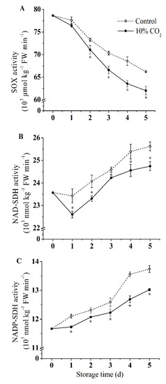 Effect of CO2 on activities of SOX (A), NAD-SDH (B), and NADP-SDH (C) of fresh-cut pear fruit during storage. Values are presented as means ± SD (n = 9). Asterisks (*) indicate significant differences at the same time between controls and CO2-treated fruit according to the Student’s-test (p < 0.05).