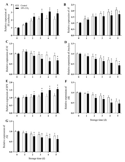 Effect of CO2 on gene expression levels of SS-synthesis (A), AI (B), NI (C), Amylase (D), SPS (E), HK (F), and FK (G) of fresh-cut pear fruit during storage. Values are presented as means ± SD (n = 9). Asterisks (*) indicate significant differences at the same time between controls and CO2-treated fruit according to the Student’s-test (p < 0.05).