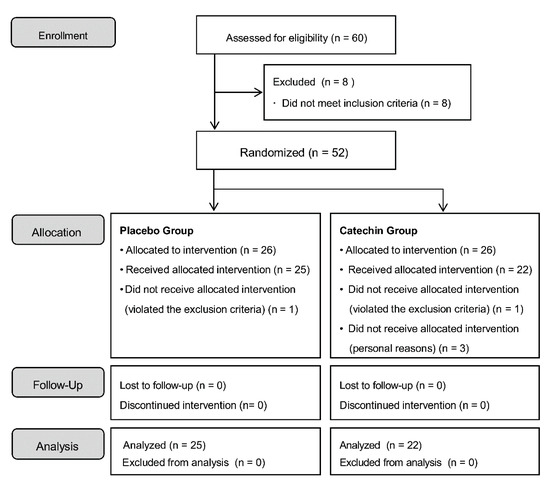 The study flow diagram is shown in Figure 1. After consideration of study inclusion and exclusion criteria, 52 patients were enrolled in the study. After allocation, one person in the placebo group and one person in the catechin group violated the exclusion criteria. Three people in the catechin group dropped out of the study during the test period due to personal reasons. The final analysis set was comprised of 25 subjects (12 males and 13 females) in the placebo group and 22 subjects (12 males and 10 females) in the catechin group. The clinical characteristics of the patients for this study are shown in Table 1. For ethical reasons, the intake of beverages containing polyphenols was not limited. The study participants also drank tea in their daily lives. Before the intervention, we investigated the amount of green tea consumed by the participants in their daily lives and found that the placebo group consumed 5.24 ± 5.6 cups/week and the matcha group consumed 8.43 ± 9.6 cups/week. No significant difference was observed between the two groups. Therefore, the participants took the test sample and also consumed approximately one cup of green tea per day.