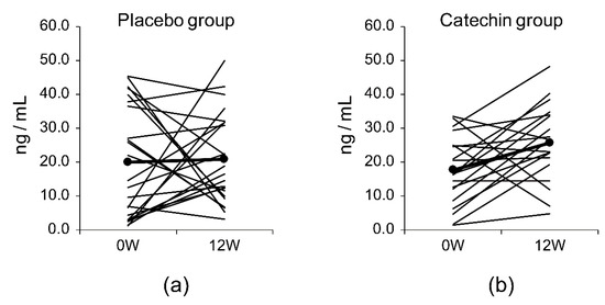 Serum BDNF levels over 12 weeks (W) in the (a) placebo group and (b) catechin group.
