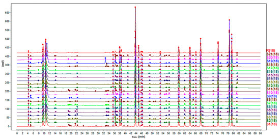 HPLC fingerprints of the 21 batches of toad venom extracts.
