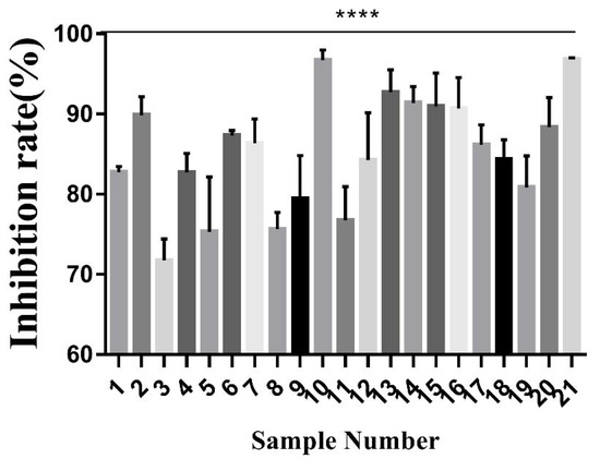 Cell proliferation assay was applied to distinguish the pharmacodynamics and in vitro cytotoxicity of the toad venom extracts on A549 cells. As shown in Figure 3 and Table 5, the lowest ratio was 71.752% (sample 3), and the highest ratio was 96.811% (sample 21). The test results showed a significant difference in the pharmacodynamics of these extracts. These data provide a basis to study the screen of the main active ingredients.