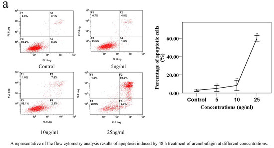 Apoptosis degree was measured by Annexin V staining (Biosharp Biotechnology (Shanghai, China)). Firstly, A549 cells were incubated with the tested compound (arenobufagin) for 48 h, then collected from six-well plates, washed once with cold PBS (4C), and centrifuged (2000 rpm for 5 min) before being suspended with a 300 μL binding buffer. Annexin V-FITC (6 μL) was then added and the cells were stained in the dark for 15 min before adding 6 μL propidium iodide and 300 μL binding buffer. Apoptosis quantification was counted by flow cytometry (FC 500MCL, Beckman Coulter, Indianapolis, IN, USA).