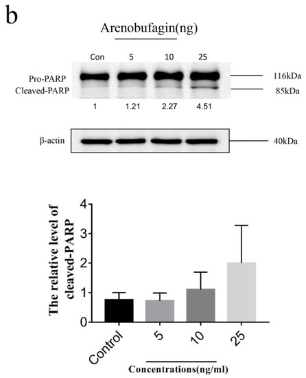 The cell samples were treated with arenobufagin (0, 5, 10, 25 ng) for 48 h. After incubation, the cells were suspended in lysis buffer (Tris-HCl, NaCl, EDTA, EGTA, NP-40 and PMSF) (Beyotime Institute of Biotechnology) on ice for 30 min and vortexed for 60 s, then centrifuged at 16,000 rpm at 4 °C for 20 min. Protein content was quantified by BCA assay kit (Thermo Fisher Scientific, Waltham, MA, USA). Protein samples with appropriate concentration were loaded on 10% sodium dodecyl sulfate-polyacrylamide gel electrophoresis (SDS-PAGE) gel in a 2 h run under 100 V. Subsequently, the proteins were transferred to polyvinylidene fluoride (PVDF) membranes by wet transfer electrophoresis. The membranes were blocked with skimmed milk before being incubated with the primary detection antibody PARP (Cell Signaling Technology, 1:1000), after being washed by TBS-T for 30 min. The membranes were then probed with counterpart secondary antibodies (Cell Signaling, 1:5000), and visualized by chemiluminescence (Bio-Rad, Hercules, CA, USA).