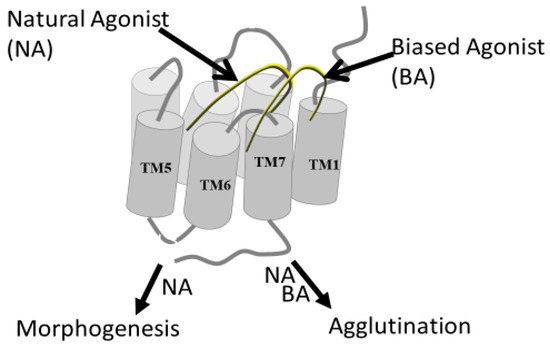 Biased agonism. This diagram shows two peptides, one the naturally occurring α-factor, a normal agonist (NA), and the other a biased agonist (BA) that preferentially initiates different signaling pathways (morphogenesis or agglutination). The BA initiates agglutination at a much lower concentration than that of NA, whereas the NA initiates both similarly [44].