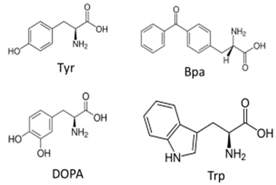 Structures of tyrosine (Tyr), 3,4-dihydoxyphenylanine (DOPA), tryptophan (Trp), and 4-benzoylphenylalanine (BPA).