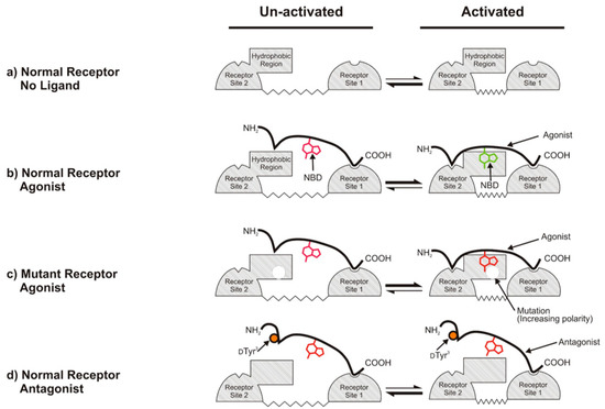 Model for the binding and activation of normal and mutant α-factor receptors by different ligands. Ligand-interacting surfaces on the receptor are indicated by cross-hatching. Site I interacts with the C-termini of ligands and is likely to consist of the extracellular end of the first transmembrane segment. Site 2 interacts with the N-terminus of ligands and most likely consists of the extracellular end of the sixth transmembrane segment and the third extracellular loop of the receptor. The conformational equilibrium between the inactive and activated states of the receptor is represented as a change in the distance between Site 1 and Site 2. (a) In the absence of ligand, the receptor favors the inactivated state with a large separation between ligand contact sites. (b) Binding of the agonist to normal receptors favors the activated state. (c) Mutations affecting the emission spectrum of bound agonist change the environment of the fluorophore (red shift) without altering the receptor ligand binding or, generally, activation. (d) Binding of ligands that act as antagonists toward normal receptors (labeled antagonist) does not alter the conformational equilibrium of the receptor. Activation-specific interactions with the N-terminus of the ligand are blocked by the d-Tyr3 substitution (orange circle), leaving the NBD group attached at Lys7 exposed to the solvent, and the C-terminal region of the antagonist (which is identical to the corresponding region of agonist) maintains a high-affinity interaction with the receptor. Adapted with permission from [71].