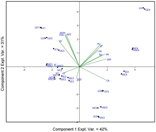 PCA bi-plot (% explained total variance: PC-1, 42%; PC-2, 31%) of the three red wines closed with different stoppers considering the phenolic profiles and the dissolved oxygen (DO2) during 12 months of bottle storage. Samples: SC and SSC, St. Magdalener closed with conventional stopper or ‘blend’ stopper, respectively. LC, LSC, Lagrein with conventional or ’blend’ stopper, respectively; MC, MSC, Merlot. Storage in bottle: 1, wine just after bottling; 2,3,4,5, wine analyzed one, three, six and 12 months after bottling, respectively. Phenolic compounds: MON, non-acylated anthocyanins; ACE, acetylated anthocyanins; COU, coumaroylated anthocyanins; GA, gallic acid; PR, protocatechuic acid; GRP, glutathionyl caftaric acid; CA, caftaric acid; CF, caffeic acid; CT, catechin; EC, epicatechin; SY, syringic acid; PC, p-coumaric acid; RE, resveratrol.