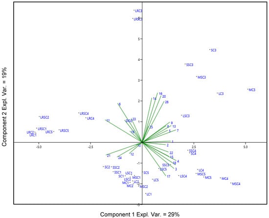 PCA bi-plot (PC-1 29%, PC-2 19%) of the three red wines and the rosé wine closed with different stoppers considering the volatile profiles and the dissolved oxygen (DO2) during 12 months of bottle storage. Samples: LRC, LRSC, Lagrein rosé closed with conventional or ’blend’ stopper, respectively. SC and SSC, St. Magdalener with conventional or ‘blend’ stopper. LC, LSC, same for Lagrein. MC, MSC, Merlot. Storage in bottle: 1, wine just after bottling; 2,3,4,5, wine analyzed one, three, six and 12 months after bottling, respectively. Volatile compounds are named 1–26 as listed in Table 4.
