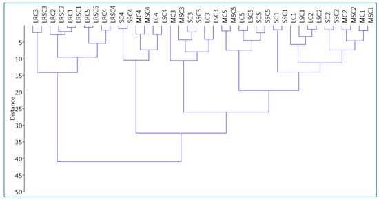 Hierarchical cluster analysis (HCA) of the four wines during 12 months of bottle storage. Samples: LRC, LRSC, Lagrein rosé closed with conventional or ’blend’ stopper, respectively. SC and SSC, St. Magdalener with conventional or ‘blend’ stopper. LC, LSC, same for Lagrein. MC, MSC, Merlot. Storage in bottle: 1, wine just after bottling; 2,3,4,5, wine analyzed one, three, six and 12 months after bottling, respectively.