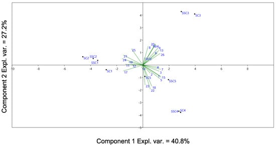 PC1 (exp. variance = 40.8%) vs. PC2 (exp. variance = 27.2%) model for St. Magdalener wines. Volatile compound relative abundances and measured dissolved oxygen were used as variables. Volatile compound labels (1–26) are explained in Table 4.
