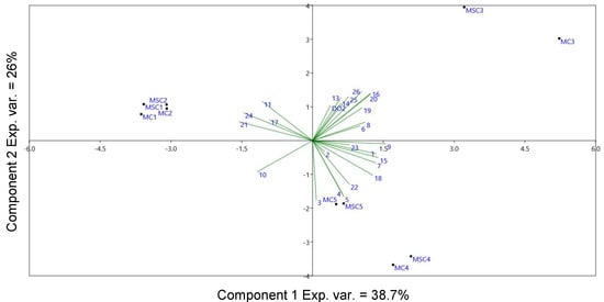 PC1 (exp. variance = 38.7%) vs. PC2 (exp. variance = 26%) model for Merlot wines. Volatile compound relative abundances and measured dissolved oxygen were used as variables. Volatile compounds labels (1–26) are explained in Table 4.