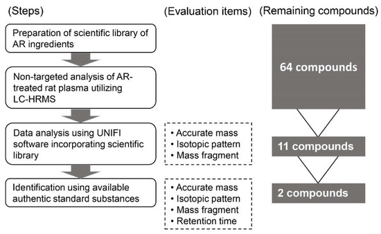 Non-targeted analysis utilizing LC-HRMS is useful within the pharmacokinetic study of multicomponent products such as those of Kampo medicine, because this analysis enables the acquisition of data for a vast number of components absorbed following drug administration via plasma analysis. Therefore, in this study, we adopted a non-targeted analysis to explore and identify bioavailable AR ingredients. The analysis proceeded in multiple steps (see Figure 1). First, before sample analysis, we prepared an original database that included information about chemical structure, monoisotopic mass, etc., for AR ingredients. Next, we analyzed data from the non-targeted analysis of plasma samples using UNIFI software (Waters, Milford, MA, USA), which is an integrated informatics platform that incorporated the database into a streamlined workflow aimed at identifying chemical components from complex raw data. In our previous non-targeted analysis of plasma following the administration of a natural product, we utilized a well-established database (e.g., kegg compound database); however, many candidate compounds, not only phytomedicines but also endogenous substances (which have same chemical formula and monoisotopic mass), were assigned to one detected peak. Consequently, we could not identify which peaks represented accurate compounds. This incident is widely considered problematic when performing non-targeted analyses of natural products, although researchers have attempted several assign methods or used high-performance technologies such as multiple-stage mass spectrometric analysis. To resolve this problem, we made an original database of 64 AR ingredients based on the Kampo database [36], articles [29,37], and a book [38], which reported ingredients contained in AR (see the list of 64 ingredients shown in Table S1). We believe that this method of non-targeted analysis is quite useful for identifying bioavailable ingredients in natural products.