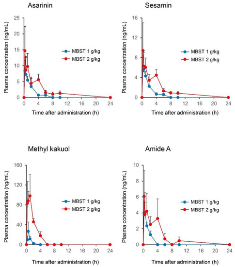 The Cmax and area under the plasma concentration-time curve from zero to final observation time (AUC0-last) of all compounds were increased in a dose-dependent manner (Figure 2 and Table 2). Meanwhile, the plasma concentration-time curves of asarinin, sesamin, and amide A showed bimodality or trimodality at the 2 g/kg dose group but not at the 1 g/kg dose group (Figure 2). Unfortunately, it remains unclear why this phenomenon only occurred at a high dose of MBST. Some pharmacokinetic studies focusing on flavonoid aglycons and glycosides have reported bimodal or trimodal plasma concentrations of aglycon and refer to the involvement of enterohepatic circulation and the time required for metabolism from glycoside to aglycon by enterobacterium [43,44]. In the plasma concentrations of methyl kakuol, the degrees of increase in Cmax and AUC0-last were not proportional to the dosage increases in MBST (Figure 2 and Table 2). Because multi-ingredient drugs sometimes undergo self-pharmacokinetic interactions (e.g., modification of absorption or metabolism ratio) among their ingredients [45], it is speculated that other co-existing ingredients affected the pharmacokinetics of methyl kakuol at a high dose of MBST. To address the mechanisms of the non-linear pharmacokinetics, future studies, e.g., the verification of the pharmacokinetics following the sole administration of methyl kakuol, are needed.