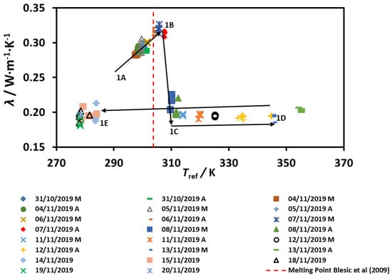 The thermal conductivity of [C2mim][CH3SO3]—Sample 1. The legend indicates the dates with “M” = morning, and “A” = afternoon. Arrows indicate the temperature variation, 1A to 1D (heating) and 1D to 1E (cooling).